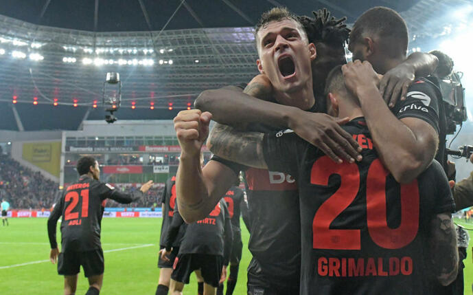 - In dieser Bundesliga-Saison ist Grimaldo an 17 Toren direkt beteiligt gewesen. Er traf zum vorentscheidenden 2:0 gegen die Bayern, kommt auf 8 Treffer und 9 Tor-Vorlagen.