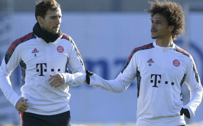 Zum Beginn der Einheit nahm Goretzka seinen Mitspieler Serge Gnabry huckepack. Er hatte sich seit Monaten mit Problemen an der Patellasehne herumgeplagt. Sein letztes Pflichtspiel bestritt der 27-Jährige am 4. Dezember bei Borussia Dortmund (3:2).