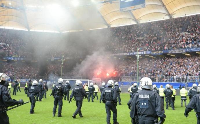 Rund 100 bis 150 Gewalttäter im Volksparkstadion hatten kurz vor dem Abpfiff in einer offenbar geplanten Aktion Pyrotechnik gezündet und Pappen verbrannt und für die hässlichen Bilder des bis dahin würdevollen Abgangs des HSV nach 55 Jahren aus der Bundesliga gesorgt. Das Spiel musste für längere Zeit unterbrochen werden, ehe Schiedsrichter Felix Brych die Partie noch einmal kurz anpfiff und Sekunden später korrekt beendete.