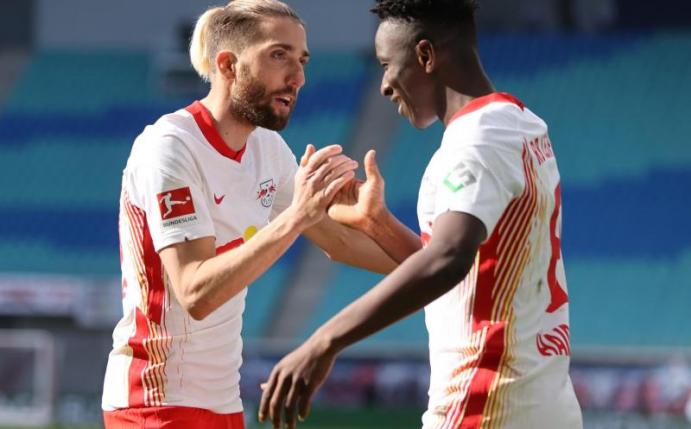 Trotz des Erfolgs der Sachsen und der Niederlage von Tabellenführer Bayern am Tag zuvor in Mainz (1:2) beträgt der Abstand noch immer sieben Punkte bei noch drei ausstehenden Spielen. Amadou Haidara (46.) und Emil Forsberg (67.) per Foulelfmeter erzielten die Treffer. Die Gäste mussten schon von der 13. Minute an in Unterzahl spielen. Naouirou Ahamada hatte wegen groben Foulspiels die Rote Karte gesehen. Für den VfB war es die vierte Niederlage nacheinander.