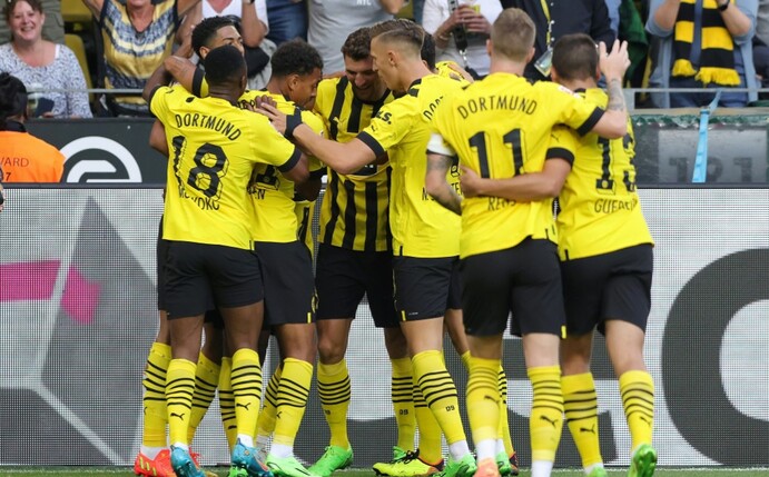 Der neue Trainer Edin Terzic musste auf die verletzten Zugänge Niklas Süle und Salih Özcan verzichten, im Sturm entfachte er eine Art Bayern-Wirbel light: Der allerdings früh verletzte Karim Adeyemi, Youssoufa Moukoko und Donyell Malen fingen das Fehlen des schwer erkrankten Erling-Haaland-Nachfolgers Sebastien Haller (Hodenkrebs) im Kollektiv ordentlich auf. Bei Bayer kam der neue Stürmer Adam Hlozek zur Pause ins Spiel.