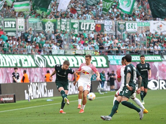 Beide Teams starteten vor 47.069 Zuschauern in der Red Bull Arena kontrolliert in die Partie. In einer ausgeglichenen Anfangsphase kam es auf keiner Seite zu großen Chancen, auch weil die letzte Präzision fehlte. Doch Bremen hatte zunehmend mehr vom Spiel und kam einige Male gefährlich in den Strafraum. Die Gastgeber verteidigten die Aktionen zunächst, traten selbst offensiv in dieser Phase jedoch kaum in Erscheinung. Seiwald lenkte den Ball schließlich unglücklich ins eigene Tor, auch in der Folge ließ Bremen nicht nach und bestimmte das Geschehen.