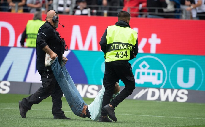 Kurz nach dem Anpfiff der Bundesliga-Partie von Eintracht Frankfurt gegen den VfL Wolfsburg haben erneut Klimaaktivisten der «Letzten Generation» für eine kurzzeitige Unterbrechung gesorgt.