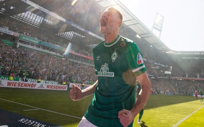 Mit einem Arbeitssieg zum Aufstieg: Werder Bremen ist nach einem Jahr Zweitklassigkeit wieder in die Fußball-Bundesliga zurückgekehrt. Massiv unterstützt von 41.000 Zuschauern im Weserstadion setzten sich die Hanseaten mit 2:0 (1:0) gegen Jahn Regensburg durch und behaupteten damit ihren direkten Aufstiegsplatz. "Der SVW ist wieder da", skandierte das Publikum schon nach einer Stunde Spielzeit.