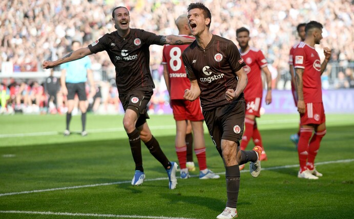 Vor 29.546 Fans im ausverkauften Millerntor-Stadion trafen Marcel Hartel (65.) und Adam Dzwigala (83.) für die gefeierten Kiezkicker, die trotz der Enttäuschung über den geplatzten Erstliga-Traum ihre beste Saison seit 2011/12 gespielt haben und bestes Heimteam der Liga waren. Die erstarkten Düsseldorfer dagegen kassierten im 13. Spiel unter Trainer Daniel Thioune ihre erste Niederlage.