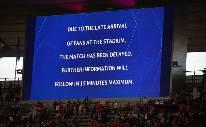 Dies geschehe aus Sicherheitsgründen, hieß es auf der Anzeigetafel. Zahlreiche Fans des FC Liverpool befanden sich kurz vor dem geplanten Anpfiff noch nicht auf den Rängen. Bilder in den sozialen Netzwerken zeigen teils chaotische Szenen beim Einlass rund um die Arena.(dpa)