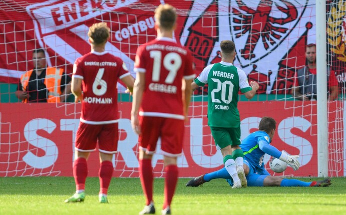 Der Bundesligist, der in der vergangenen Saison in der ersten Runde an Drittligist VfL Osnabrück gescheitert war, dominierte das Geschehen, ohne dabei sehr oft gefährlich zu werden. Marvin Ducksch traf nach einer flachen Hereingabe von Mitchell Weiser den Pfosten (10.). Energie-Keeper Alexander Sebald spielte den Bremern den Ball im eigenen Strafraum in die Füße, parierte dann jedoch gegen Niclas Füllkrug (27.). Ein Durchsteckpass von Füllkrug ließ Schmid dann kurz vor der Pause alleine auf Sebald zulaufen. Der 22-Jährige schob souverän ein.