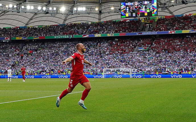 Dänemark startete am Sonntag in Gruppe C mit einem 1:1 (1:0) gegen Slowenien in die EURO 2024 in Deutschland. In Stuttgart ließ ein Mann die dänischen Fan-Massen jubeln, um dessen Leben am 12. Juni 2021 die ganze Fußball-Welt bangte: Christian Eriksen (32). Der Superstar von „Danish Dynamite“ traf zum 1:0 für sein Land – und stellte einen Rekord ein.