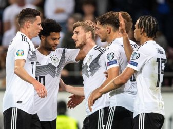 Beim lockeren 8:0 (5:0) in der EM-Qualifikation in Mainz gegen Estland beeindruckte das DFB-Team um die Doppeltorschützen Marco Reus und Serge Gnabry mit viel Tempo, Direktspiel und spielerischen Raffinessen. Neben dem Dortmunder Reus (10. und 37. Minute) und dem Münchner Gnabry (17. und 63.) sorgten Leon Goretzka (20.), Ilkay Gündogan (26./Foulelfmeter), Timo Werner (79.) und Leroy Sané (88.) für den deutlichen Erfolg der Gastgeber.