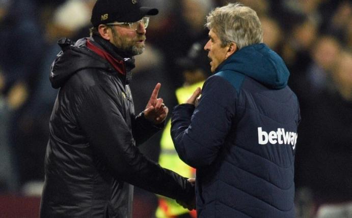 Teammanager Jürgen Klopp vom Premier-League-Spitzenreiter FC Liverpool hat sich nach dem 1:1 (1:1) in der englischen Fußball-Meisterschaft bei West Ham United Sticheleien seines Widersachers Manuel Pellegrini gefallen lassen müssen. "Klopp ist gewohnt, durch Abseitstore zu gewinnen", sagte der chilenische Hammers-Coach über Liverpools 1:0-Führung nach einer klaren Abseitsposition und erinnerte mit seinem Seitenhieb an Klopps 3:2-Erfolg mit Borussia Dortmund im Champions-League-Viertelfinale 2013 gegen den FC Malaga mit Pellegrini auf der Bank.