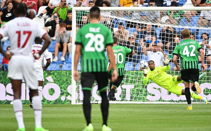 Der italienische Fußball-Meister AC Mailand ist nur knapp an der ersten Saisonniederlage vorbeigeschrammt. Die Rossoneri kamen bei Sassuolo Calcio nicht über ein mageres 0:0 hinaus und hatten sogar Glück, dass Torwart Mike Maignan einen Foulelfmeter von Nationalspieler Domenico Berardi parieren konnte (23.).
