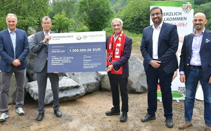 Der umstrittene WM-Gastgeber Katar engagiert sich in der Fluthilfe für das stark betroffene Ahrtal und übergab am Montag beim ersten Spatenstich in Hönningen einen Scheck von einer Million Euro für den Neubau von acht Kinderfußballplätzen im Landkreis Ahrweiler. Das Emirat ist Ende des Jahres erstmals Ausrichter einer WM-Endrunde (21. November bis 18. Dezember).