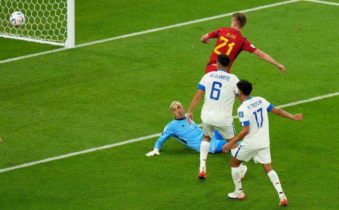 Dani Olmo hat mit dem Auftakttreffer für Spanien bei der Fußball-Weltmeisterschaft in Katar auch noch ein Jubiläumstor erzielt. Die 1:0-Führung in der elften Minute im Al-Thumama Stadion von Doha gegen Costa Rica war der 100. WM-Treffer des Titelträgers von 2010.