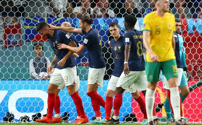 Frankreichs Vorgänger als Weltmeister - Italien, Spanien und zuletzt auch Deutschland - waren bei den Turnieren nach ihrem Triumph allesamt in der Vorrunde ausgeschieden. Ein Fehlstart schien auch den Franzosen zu drohen, als Craig Goodwin die Australier bei ihrer fünften WM-Teilnahme in Folge in Führung brachte (9.). Doch Adrien Rabiot (27.) und Olivier Giroud (32.), Ersatz des verletzten Ballon-d'Or-Gewinners Karim Benzema, drehten das Spiel noch vor der Pause. Kylian Mbappé (68.) und abermals Giroud (71.) legten nach. Mit seinem 51. Länderspieltreffer stieg der Doppeltorschütze gemeinsam mit Thierry Henry zum Rekordtorschützen Frankreichs auf.