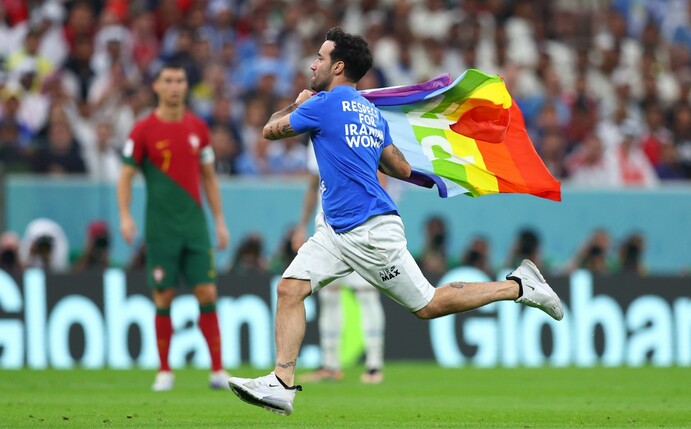 Im WM-Spiel zwischen Portugal und Uruguay (2:0) sorgte ein Italiener in Katar mit drei politischen Botschaften für Aufsehen. Der Mann, der in der zweiten Halbzeit des Gruppenspiels den Rasen stürmte, hielt eine Regenbogenfahne in der Hand. Auf der Vorderseite seines Superman-T-Shirts stand «Save Ukraine», auf der Rückseite «Respect for Iranian Woman». Der Mann ist Medienberichten zufolge bereits mehrfach bei internationalen Wettbewerben wie den Weltmeisterschaften 2010 und 2014, in der Champions League und der italienischen Serie A als Flitzer in Erscheinung getreten.
