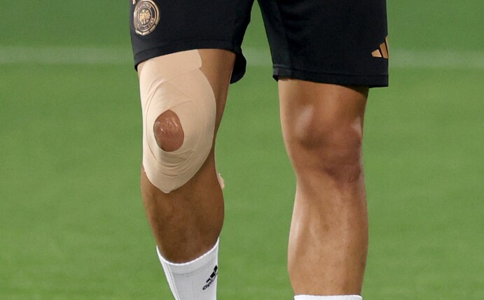 Die TV-Kameras zoomen auf das rechte Knie, als sich Leroy Sané am Spielfeldrand auf einer Kiste sitzend die Schnürsenkel bindet.